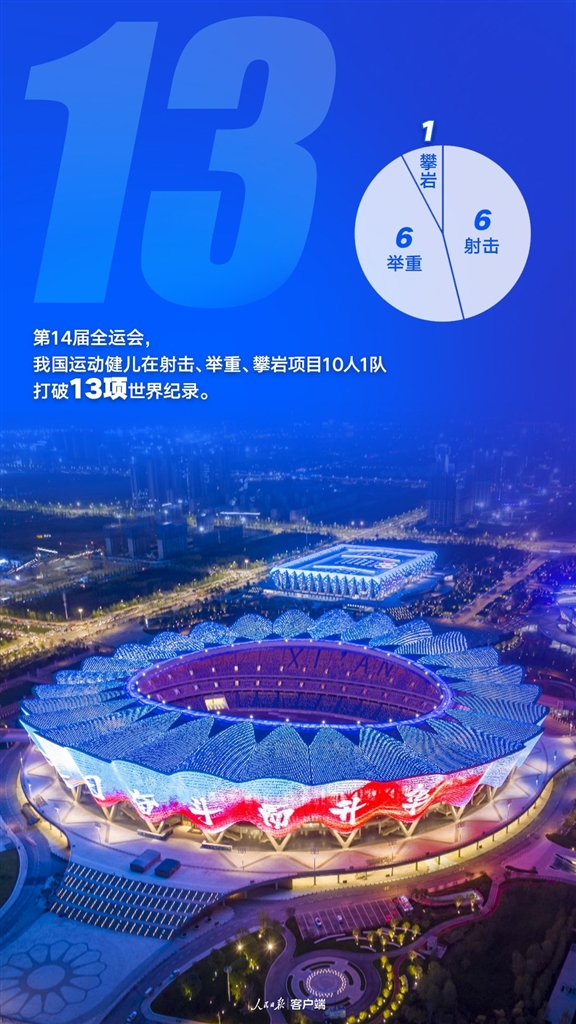 | 第14届全运会在陕西省举办,本届全运会共设35个大项,410个小项,项目设置超过奥运会。我国运动健儿在射击、举重、攀岩项目中,10人1队打破13项世界纪录。 |