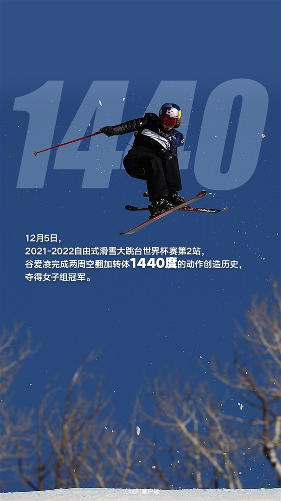 | 12月5日,2021-2022自由式滑雪大跳台世界杯赛第2站,谷爱凌完成两周空翻加转体1440度的动作,创造历史,夺得女子组冠军。