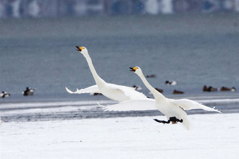 12月17日,两只大天鹅在山东荣成大天鹅国家级自然保护区天鹅湖畔降落。