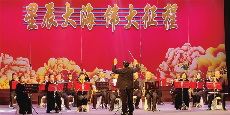 文艺演出过半时,舞台上出现了“幸福时光”铜管交响乐团的身影。66岁的指挥龙林抬手间,交响乐版《唱支山歌给党听》响起。乐曲深情而绵长,缓缓淌进观众心田。幸福的号角已吹响,他们将再次续写幸福时光新篇章。