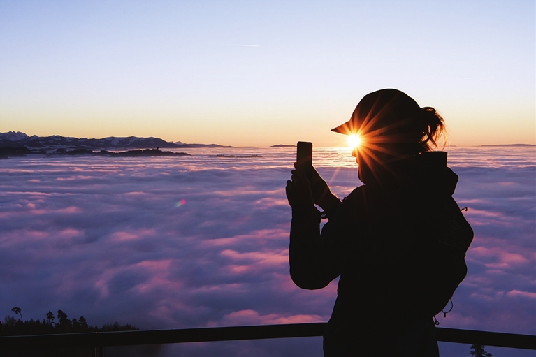 12月19日,一名男子在瑞士博利根的伯尔尼-邦蒂热电视塔上拍摄落日时分的雾海景色。 新华社 发