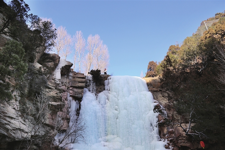 柳跖沟尽头,冰瀑从山顶倾泻而下,将瀑布流水的形态凝结、定格在十几米高的山体上,如万箭待发、气势如虹。登高远眺,冰河蜿蜒流长,贯穿整个景区,在两岸绝壁和松柏的交相掩映下,犹如一条银色巨龙盘绕在山谷之中。