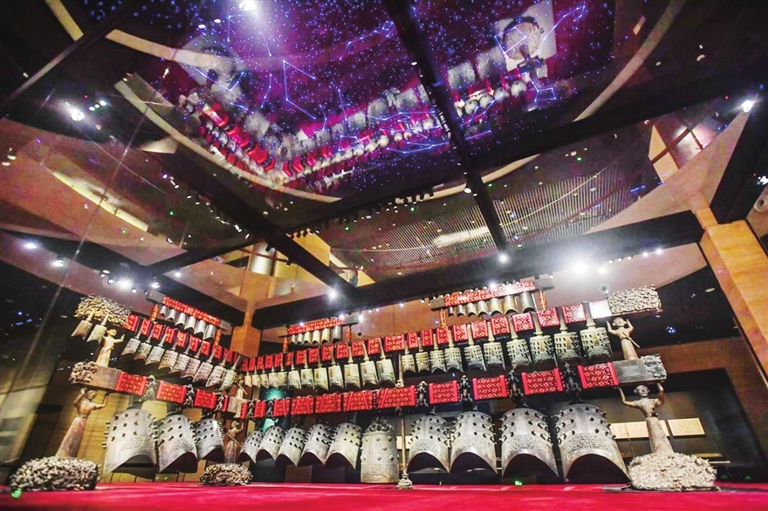 编钟的人气,也决定了它在新馆的位置。记者看到,从旧馆迁入新馆“曾侯乙”展厅后,曾侯乙编钟依然是定海神针般的存在,其陈列环境也全面升级,远观大气磅礴,近看威严肃穆,抬头望去,眼中竟是一片蔚蓝星空。