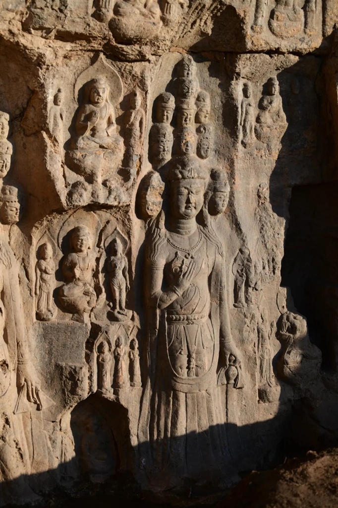 窟前遗址共布设探方20个,目前仍在发掘清理之中。造像窟龛的雕凿非常集中,层叠分布于崖壁中部以北,密集区域多达8层。初步统计,共70余龛、约300尊造像。崖壁上方有一尊高达6米坐佛,为唐代高武时期雕凿而成。