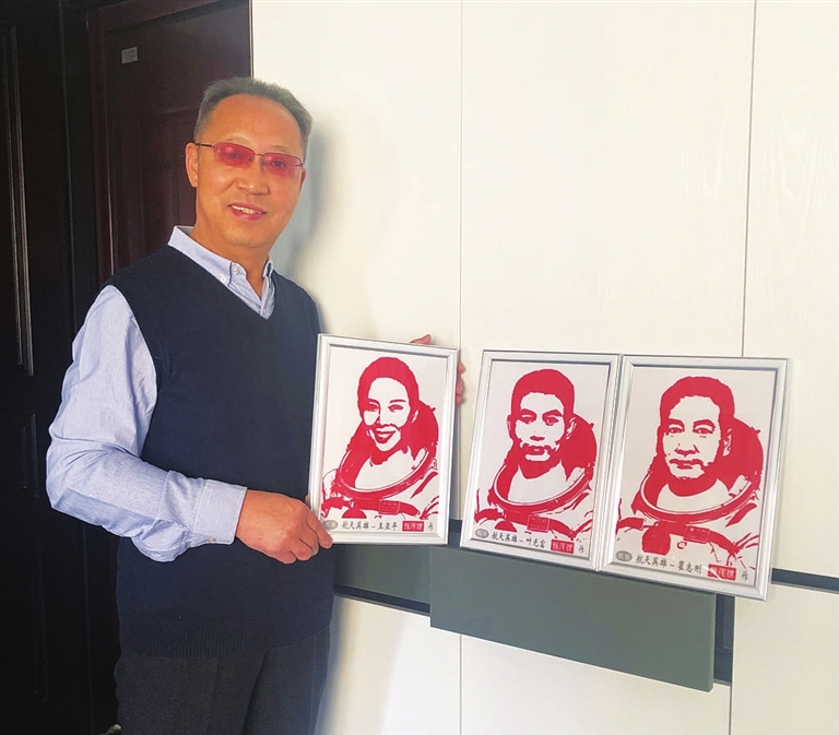 孙茂杰今年60岁,多年来坚持学习书法、绘画、剪纸等,30多年来创作了3000余件作品,曾多次在全国、省、市书画大赛中获奖。“今年10月中旬,神舟十三号乘组航天员翟志刚、王亚平、叶光富顺利进入太空。这样的大事,我一定要用擅长的剪纸作品记录下来。”有了想法后,孙茂杰迅速行动,找照片、画样图、刀剪结合,仅用一周时间,形象逼真的剪纸作品顺利完成。