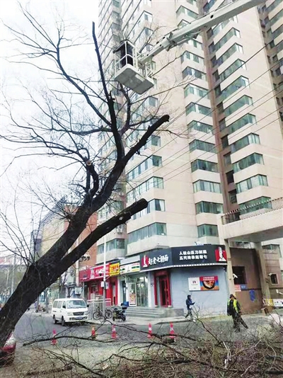 12月24日上午,迎泽区园林绿化中心工作人员前往现场,查看柳树情况,制定处理方案。据工作人员介绍,这棵柳树有30年树龄,其根部较浅导致倾斜。“倾斜太严重,有很大的安全隐患,而且紧挨旁边小区围墙,一旦倒了,很有可能损坏围墙。”现场一名负责人告诉记者,为了居民和路人的安全,他们决定锯掉这棵柳树。经过工作人员一上午的努力,大树被锯断拉走,问题得到彻底解决。