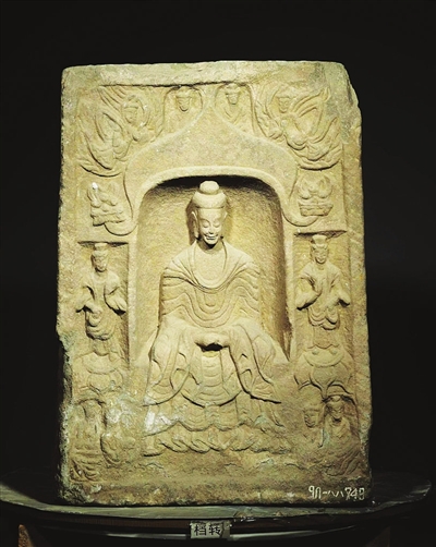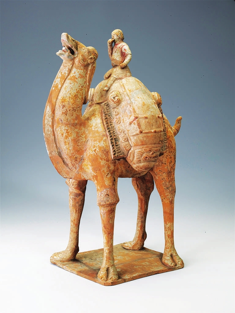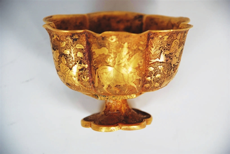 山西博物院参展的彩绘骑驼俑,隋代,高45.7厘米,太原市沙沟村斛律彻墓出土。骆驼昂首站立,双峰间驼有丝绢、皮囊等物,囊端饰虎头图案。皮囊上坐一人,浓眉、深目、高鼻,头戴圆毡帽,手中抓着一个饼,正在边走边吃,反映出胡商行旅图中的辛苦。仔细观察,胡商手里的饼子,当地称为“馕”,传入中国后,被称为“胡饼”,当时人民都爱吃。墓葬的主人斛律彻,其部落是塞北的游牧民族,后进入中原,扎根山西。四面佛龛造像塔,北朝,高45厘米,上宽33厘米,下宽40厘米。六曲花卉纹金杯,唐代,通高5.4厘米,口径7.9厘米,底径3.5厘米。