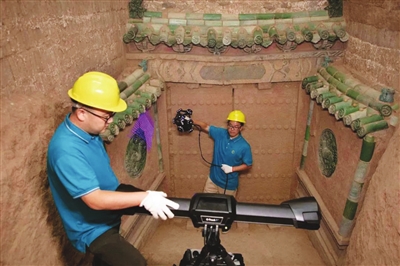 此次考古过程中,文物保护与科技考古深度融合,运用控制测量、三维激光扫描等数字化技术,建立陵园空间三维测绘基准体系。以考古调查、发掘结果为依据,对陵园结构进行三维动态虚拟复原,再现陵园整体风貌。在发掘现场建设文物保护实验室,对墓室环境展开实时监测,通过多学科合作,不仅对脆弱文物实施了及时妥善保护,同时获取了更全面信息,为做好晋端王陵园遗址的保护和研究提供了科学依据。