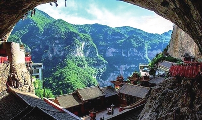 建筑之外的绵山,多陡峭悬崖,险峻石壁,古柏森林,阳光下明丽清朗,山的整体或局部如天工巧作,造型特异。线条纵横弯曲错综参差,阴阳向背,千姿万态,宏雄博大。