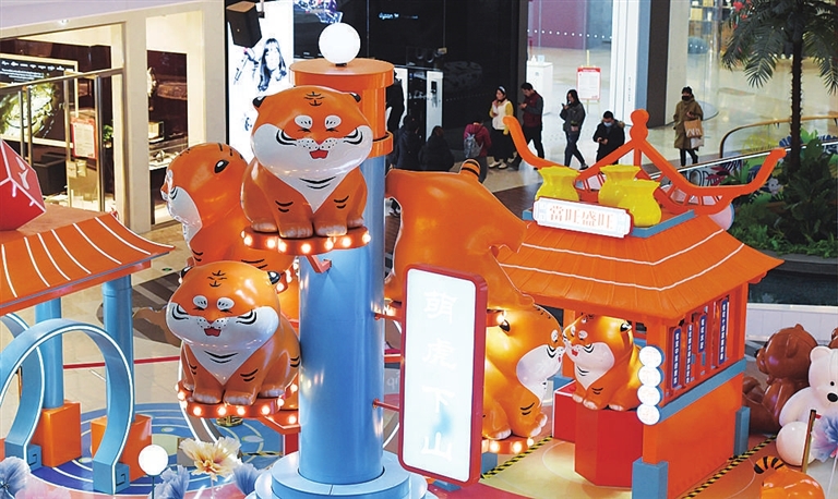 12月27日,省城某商场内,卡通虎雕塑摆件吸引着市民的目光。随着虎年临近,各种带有“虎”元素的服饰、摆件等受到消费者青睐。 记者 邓寅明 摄