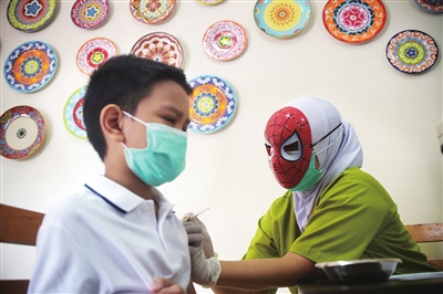 12月29日,佩戴“蜘蛛侠”面具的医务人员在印度尼西亚雅加达为儿童注射新冠疫苗。