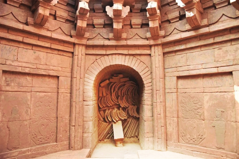 宋元墓葬集中分布在东西长200米、南北宽30米的范围内,均坐北朝南,除一座砖室墓外,多为土洞墓,均为平民墓。出土器物主要有陶器、瓷器、铜钱、铜镜等。31号墓发现15件不规则“铭瓦”,出土4块买地券。33号墓内壁有精美砖雕,北壁为妇人启门图,东北、西北两壁为窗棂、桌椅砖雕,东、西两壁为耳室,东南、西南两壁为侍女赏花砖雕,出土陶罐、盆共44件,人骨37具,买地券1块。