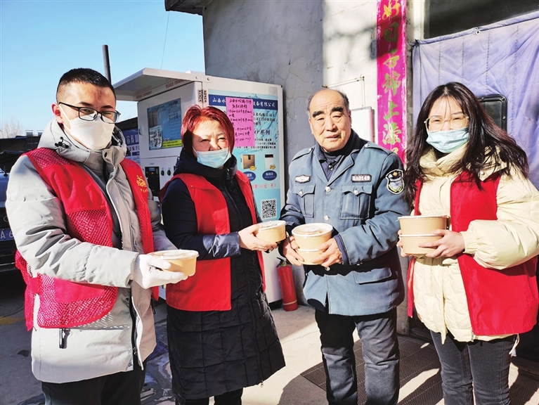 社区党委负责人介绍,进入农历腊月后,我市出现连续低温天气。数九寒天里,物业保安、保洁员仍坚守岗位,默默无闻地辛勤工作,为居民营造出干净、整洁、安全的生活环境。新年将近,为感谢一直坚守岗位的保安、保洁员,社区党委联合“爱在”公益机构,为他们送去爱心午餐和新年祝福,并叮嘱大家注意做好防风防寒措施,保重身体。