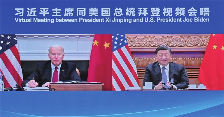 11月16日,习近平主席同美国总统拜登举行首次视频会晤,双方就事关中美关系发展的战略性、全局性、根本性问题以及共同关心的重要问题进行了充分、深入的沟通和交流。今年,习主席还应约同拜登总统两次通话。习近平主席在视频会晤中全面阐述中方对中美关系的原则立场,明确提出相互尊重、和平共处、合作共赢的战略框架,为两国关系的健康稳定发展把舵引航。两国元首就中美关系重要性、反对打“新冷战”达成原则共识。