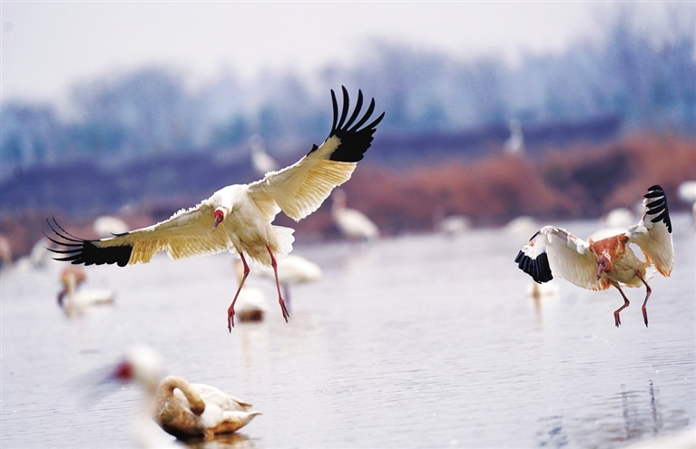 新年伊始,在位于鄱阳湖畔的南昌高新区鲤鱼洲管理处五星白鹤保护小区里,来此越冬的国家一级保护鸟类白鹤展翅起舞,姿态万千。