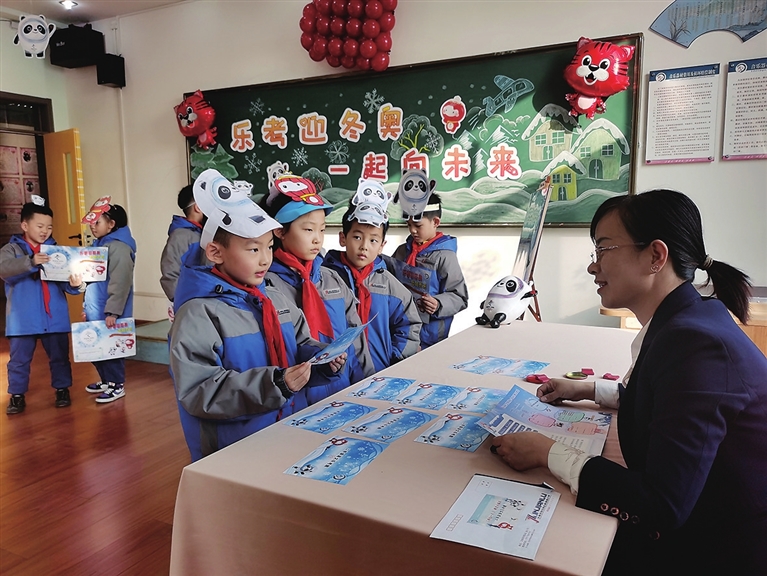 为了开展好此次以“乐考迎冬奥,一起向未来”为主题的实践活动,学校准备了一个多月,精心设计场景,用心融合学科内容。当天下午,孩子们一到校,就被北京冬奥会吉祥物“冰墩墩”和“雪容融”的人偶吸引,和它们“交流”了起来。