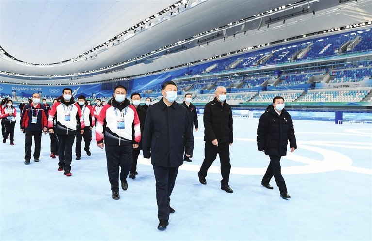 1月4日,习近平在中共中央政治局委员、北京市委书记蔡奇和市长陈吉宁陪同下,深入体育场馆、媒体中心、训练基地等,实地了解筹办备赛情况。