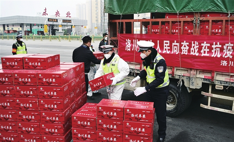 1月6日,西安市志愿者在高速未央北站出口搬运来自延安市洛川县的慰问品。