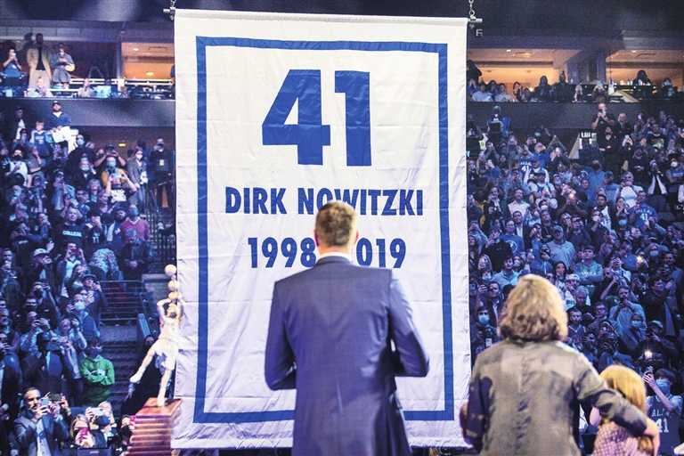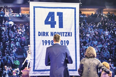 为了这一刻,许多人等待了太久。比赛时,独行侠当家球星东契奇的鞋上写着“永远的41号”,勇士主帅科尔的外套别着一枚“41号”徽章,包括库里、格林、汤普森在内的勇士众将,也提前为诺维茨基录制好了祝福视频。