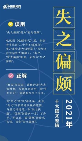 “有失”即失去,强调的是“失去”的对象,与褒义词连用,如“有失公正”,就是指失去了公正。而“失之”的“失”指失误、失当,“失之”分析的是失误的原因,与贬义词连用,如“失之狭隘”。“偏颇”指偏向一方、不公平、不公正,因“偏颇”而造成失误,当称“失之偏颇”。