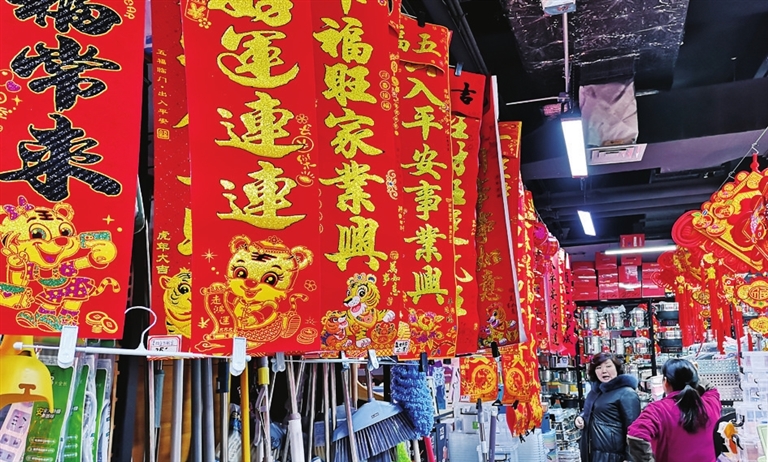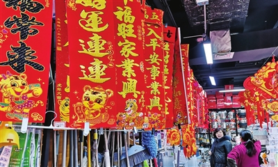 1月7日,新建南路某商场,对联、福字等商品被摆放在最显著的位置,营造出浓浓“年味”,吸引顾客前来选购。徐浩轩 摄