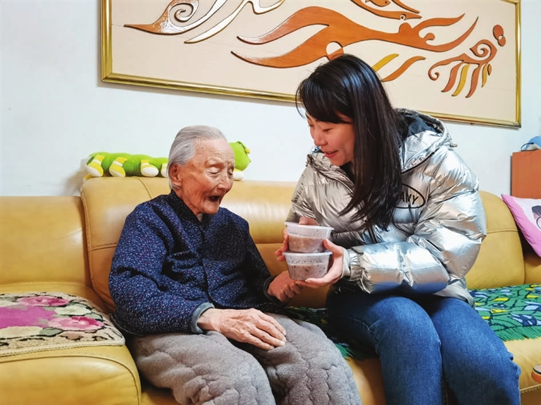 当天上午,智慧社区居家养老服务中心的工作人员将刚刚熬好的腊八粥送往高龄老人家中,表达对高龄老人的祝福。当大家赶到106岁的孟碧峰奶奶家时,老人谢绝家人的帮助,自己穿好衣服,整理好头发,借助助行器走到客厅。“我婆婆当了一辈子妇产科大夫,特别自律,生活中的事情尽量自己做。她90多岁时,还每天到公园打拳健身。现在她最大的爱好就是清洁房间,每天记日记,特别可爱!”老人的儿媳笑着说。