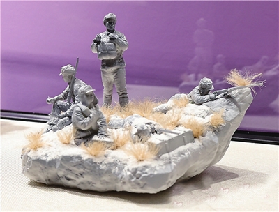 在朱肖峥的作品中,军旅题材是最为人熟知的。曾亮相上海市群众艺术馆新年模型交流赛的作品《血染的风采》,是此次个展的一大亮点。作品还原了59式中型坦克带着尖刀连冲锋的场面,对自然光影和造景细节的塑造栩栩如生。紧挨着《血染的风采》的,是朱肖峥不久前与开天工作室合作的《长津湖》,他将开天工作室制作的战士模型融入完整的战争场景,呈现出强烈的故事性。