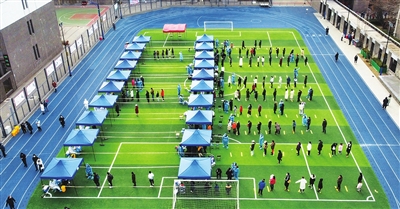 在南开区水上公园街道,社区的小学操场临时被征用为核酸检测的场地,门口的长队有序排着。穿着红色显眼羽绒服的社区工作者告诉记者:“早上4点就在群里接到全员核酸的通知了,我们5点多就出门到学校帮忙一起搭帐篷,等待大家伙儿来。”
