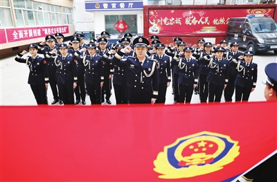 在第二个中国人民警察节到来之际,1月10日,桥东派出所组织全体民警开展了“向警旗宣誓”主题党日活动,进一步提升民警们的职业荣誉感,更好地履行党和人民赋予的新时代使命。记者 邓寅明 摄