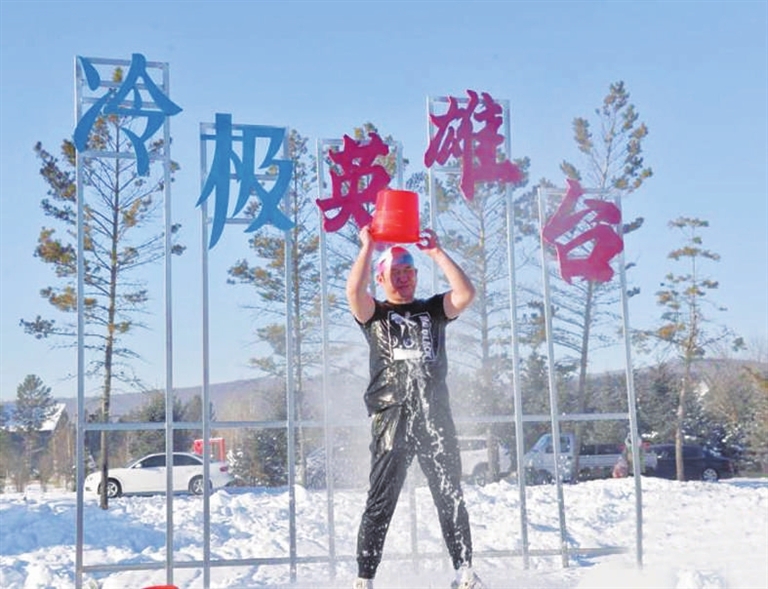 驯鹿拉雪橇、极寒马拉松、大地冰雪画……10日,第八届冷极冰雪季在内蒙古自治区呼伦贝尔根河市开幕,当日,素有“中国冷极”之称的根河气温虽跌破-40℃,人们的热情却丝毫不减。图为游客登上冷极英雄台,迎接冰桶挑战。中新社 发