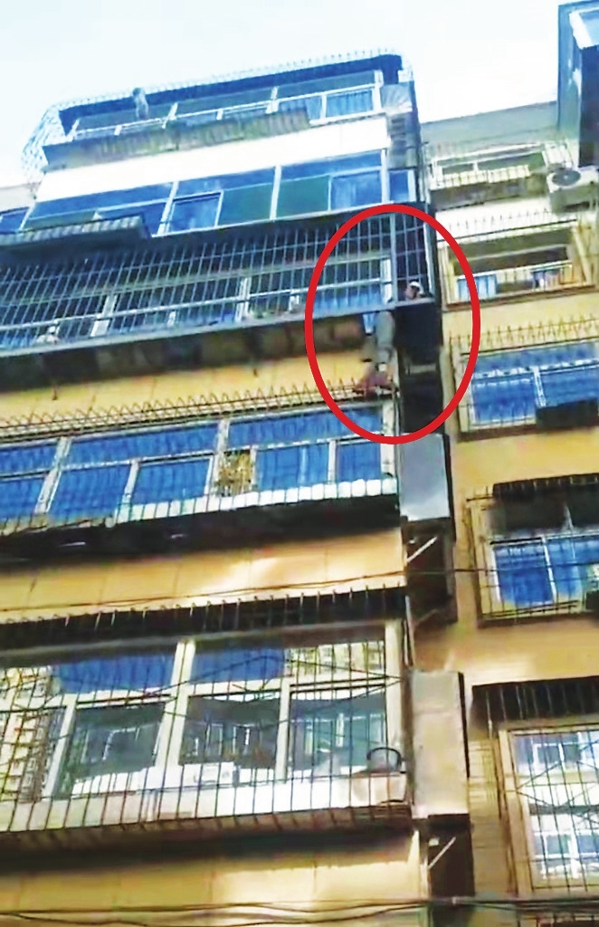 居民们介绍,发现这个人的时候是下午1时许。当时,人们发现3号楼4层窗户外的护栏上“挂”着一个人,双腿悬空,上半身卡在护栏上方,情况不明。住户们向此人喊话后发现,“挂”在护栏上的是一位大娘,她没有生命危险,但由于身体悬空,双脚没有支撑点,难以发力,无法自救。随即邻居报警。接到报警后,消防救援人员赶到了现场,迅速采取措施,固定住她的身体,将之拽起来,让双腿穿过护栏间隙,安全回到屋里,险情解除。
