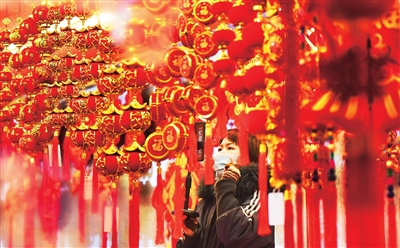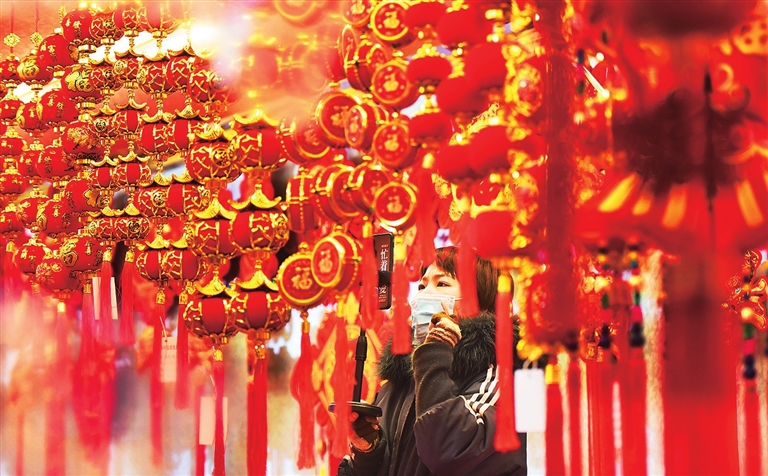1月15日,尖草坪小商品批发市场内,一商户正在进行直播卖货。随着春节临近,批发市场销售“线上线下”齐发力,年货市场一派红火景象。 记者 邓寅明 摄