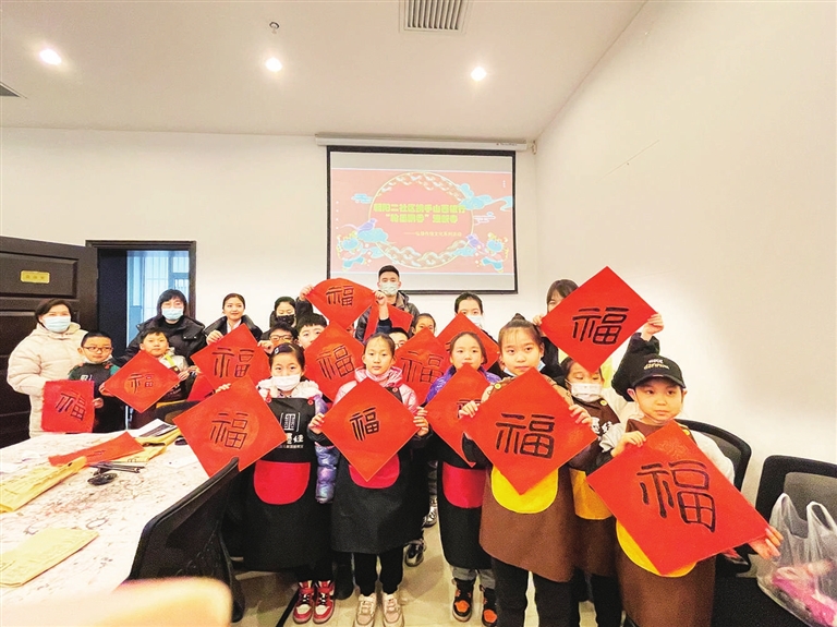 “春节时,家家户户都要贴‘福’字。其实,‘福’字最早出现在甲骨文中,是向神明或祖先奉献的意思,光表现形式就达120多种……”1月14日下午,在朝阳二社区“翰墨飘香”迎新春系列活动现场,老师首先讲解了中国文字发展及演变的历史渊源,孩子们听得津津有味。老师现场示范,如何写出漂亮的“福”,孩子们专注地一遍遍练习。