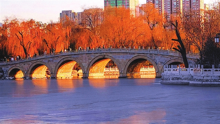 夕阳无限好,造就好风景。每当落日的余晖恰到好处地照到某一个角度的时候,就会穿过公园里的桥洞,形成这一独特的美景。 杨靳葆 摄