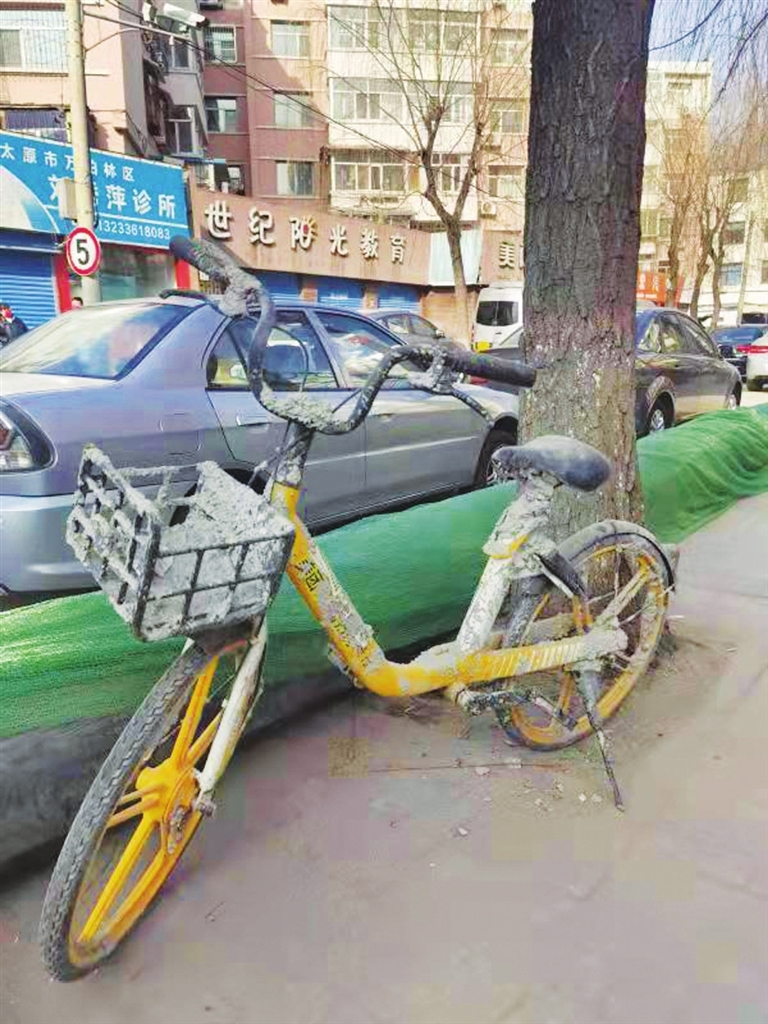 这是记者1月17日在兴华南小区拍到的图片。正在改造的居民区外,停着一辆共享单车,只见车身裹着一层厚厚的水泥,“孤苦伶仃”地立在路边。不仅无法使用,还有碍观瞻。 申波 摄