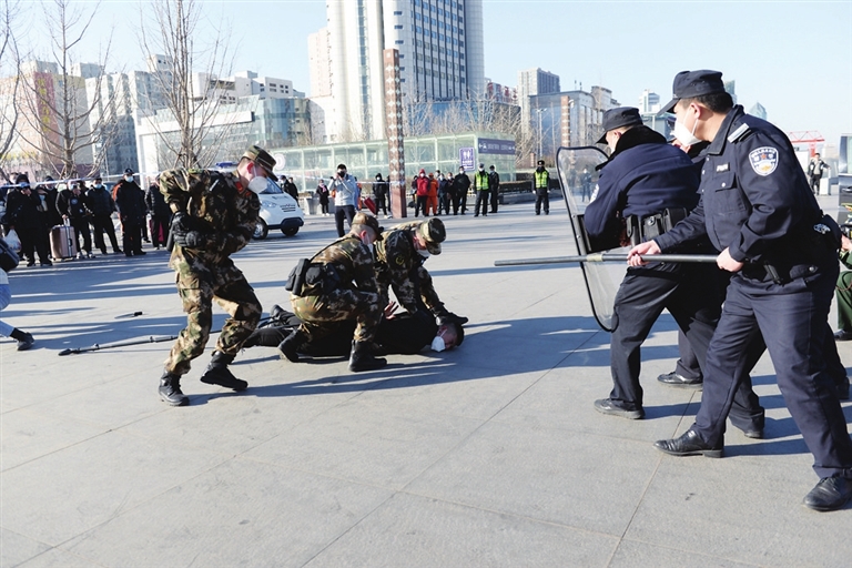 1月17日,太原车站派出所联合特警、武警等多个部门,在站前广场举行“2022年春运启动暨联勤联动反恐演练”,提升了基层一线反恐力度和应急处置能力。