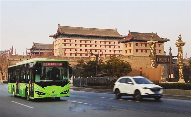 1月18日,公交车行驶在西安市永宁门外的道路上。