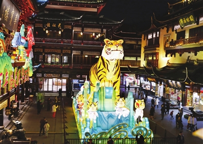 1月18日,豫园商城中心广场上“虎跃东方”巨型灯组正式亮灯。