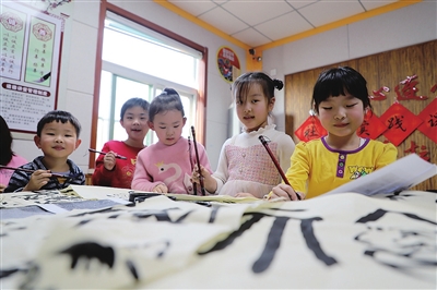 “我们的小老虎无处不在,大家找找看,这个‘福’中,‘藏’了一只小老虎。”孩子们发现,把小老虎的脸画入“福”字,便成为一只喜气洋洋的“福虎”。老师手把手教孩子们学写“福虎”,让过年时的家中充满更多“虎气”。最后,孩子们还亲手剪出不同造型的“虎”窗花。
