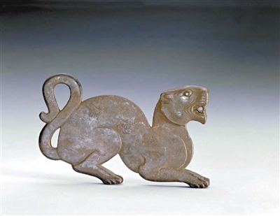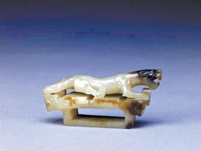 故宫收藏的玉镂雕虎形剑璏是战国末至西汉初的物品,上端为一匍匐前行之虎,面相狰狞,张口,瞪眼,呈伺机扑杀猎物之态,足尾劲健有力,显得生动活泼。下部原有纹饰,部分磨去,并开出矩形孔,变为剑璏。剑璏是古代装饰宝剑上的玉饰之一,穿系于腰带上,即可将剑固定于腰间。《说文》:“璏,剑鼻玉饰也。”所以又称为剑鼻。古代用于宝剑上的玉饰一般由四件组成,统称为“玉具剑”,除剑璏外,还有剑格、剑首和剑珌。玉具剑在春秋战国时期兴起,至汉代达到极盛,汉以后逐渐衰落、消失。历史上,它是一种代表贵族身份的宝物,也是一种珍贵的馈赠礼品。