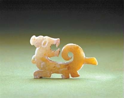 早在商代,就有品种繁多的玉器,包括工具、生活用品、佩饰及陈设用玉器。玉龙形刻刀就是商代饰品,材料为白玉质,但已沁为黄褐色。其造型为一扁薄片状的扭头卷尾的玉虎,虎张口,能看清口中的利齿。虎尾部分打磨成一小尖刀,刀刃部两面较薄。故宫博物院研究玉器的专家徐琳撰写的文章中说,商代此类小型玉质刻刀有不少,均是在尾部雕琢出刀刃,而刀柄则是各类动物的造型,有兽形、龙形、鱼形、蝉形、虎形等,大多有穿孔可系挂,使之成为可佩可用、美观实用的玉饰品。
