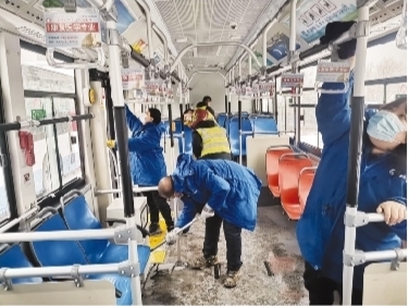 因为下雪,保洁员上岗后的第一件事就是清理公交车上的积雪。为确保准时发车,保洁员必须在有限时间内清理完所有公交车的卫生,他们开启了“突击模式”,分工明确、热火朝天地干了起来。有的清理积雪、有的清扫地板、有的擦扶手、有的擦座位、有的擦围板……大家配合默契,三五分钟的时间就能打扫完一辆车。
