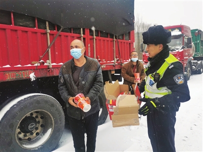 1月21日,因降雪不具备通行条件,高速交警一支队封闭了部分高速公路,但有部分货车司机滞留在吴城服务区和薛公岭路段。发现司机的窘境,当天下午2时,高速交警一支队八大队民警,将方便面和热水送到了货车司机手中,同时采用警车带道的方式,带领滞留在路段上的货车行驶到安全地带。端着热腾腾的方便面,司机们一再向民警表示感谢,民警则告知司机,已通知相关部门加快铲冰除雪,一旦达到通行要求将立即放行。