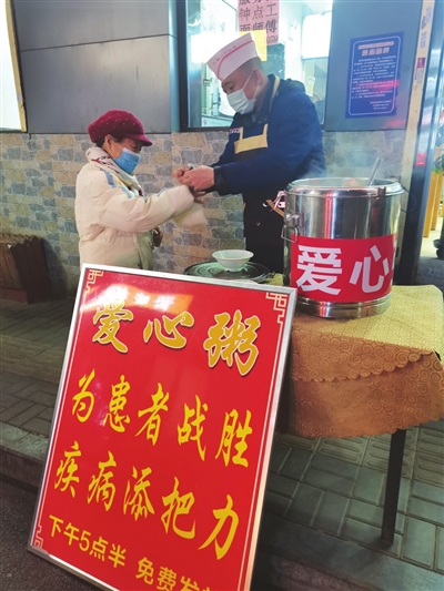 “附近有3家医院,来领粥的多是患者及家属,粥必须熬得软糯,易消化。”郭斌说,为保证“爱心粥”质量,饭店专门让他负责这项工作。在他之前,不论员工怎么换,熬粥的接力从未间断。