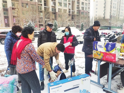 一场雪过后,康馨苑小区门口银装素裹。得知消息的居民带来旧衣、旧鞋、旧自行车、玩具、家电等闲置物品,置换桌子上摆放的食用油、洗衣液、纸抽、酱油等生活用品。志愿者们身穿红色马甲,热情地招呼“顾客”,介绍置换标准,帮助居民搬运、称重。居民们也根据自己物品的重量,挑选着心仪的生活用品。