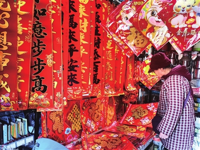 一家销售春联的摊位前,各式的春联、大红的福字、精美的年画摆满了整个专柜。一副副用不同材料制作的春联挂满了大半个墙壁,立体、植绒、卡纸等各种式样的福字,将整个柜台铺得满满当当。