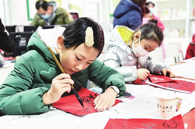 为了弘扬中国传统文化,1月20日上午,解放南路一社区红领巾学校开展未成年人“虎年纳福迎新春 创意书写福字”活动。 记者 牛利敏 摄