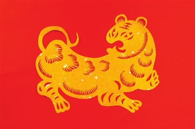 “窗上贴瑞虎,辈辈享清福。”平定人对窗花、剪纸情有独钟,每逢年节来临,大城小镇、村庄窝铺家家挂花灯、贴窗花,红彤彤的剪纸渲染出一派喜气。平定方言中,“虎”与“福”发音相近,因而老百姓对“虎”图案的剪纸尤为喜爱。这是一处位于城郊接合部的农家小院,平定县剪纸协会会长、民间剪纸艺人韩建华的家里,墙上、桌上、窗户上到处都是剪纸,有十二生肖传统图案剪纸,有平定特色婚礼盘合剪纸,还有反映乡土文化的创意作品,艳红鲜活的画面跃然眼前,纯朴的风格像是要镂空光阴,刻下岁月。印象中从事剪纸的都是俊秀手巧的姑娘媳妇们,没想到韩老师这个面相厚实的大男人剪起纸来却是这样的灵巧。年关临近,也是韩老师两口子最忙的时候,夫妇二人正在忙碌地剪“老虎”。韩老师特意选了撒金黄纸,韩嫂子则是用传统红纸,剪子在他们的手中灵巧翻飞,片刻工夫就各自变出了形态各异特色鲜明的老虎。韩老师剪出的老虎写实,猛虎下山英姿勃勃,虎视眈眈回头长啸,颇有威武气势;韩嫂子剪的老虎,只剪虎头,表情夸张表现出浓厚的装饰味,洋溢着浪漫色彩。