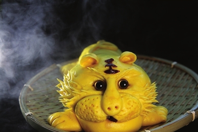 “二十八把面发,二十九蒸馒头,除夕晚上扭一扭,大年初一拱拱手。”平定至今保留着最具年味的“蒸馒头,送吉祥”风俗。一到腊月,人们便开始制作各种花样的面塑,古城里到处飘着浓浓的面香。而面塑虎是人们最喜爱的造型,虎年更是大受欢迎。百姓蒸面塑,既祭且食,现在已成为亲朋好友互相馈赠的吉祥之物。在平定当地,新生儿百天或过生日的时候,姥姥舅舅家要给孩子送面老虎,希望孩子身体强壮,成人后像虎一样威风,再就是把虎当成保护神,护佑孩子健康成长、一生平安。平定东关是老城区,时尚大方的贾如霞,快人快语热情洋溢,她有一双用面塑创业的巧手。马上要到虎年,她制作的面老虎特别受欢迎。工作台面案板上、桌角上摆着剪子、梳子、针锥等小工具,一个个面团经过揉、搓、捏、切等步骤,变成了独具特色的面老虎,真让人惊奇。上锅蒸15分钟后,面老虎出笼了,瞬间一股纯粹的面香在空气中荡漾开来。个头大、样子萌、憨态可掬的面老虎,既不拘于原形的态式,又夸张得符合规律,在似与不似之间,形象传神,美感油然而生。