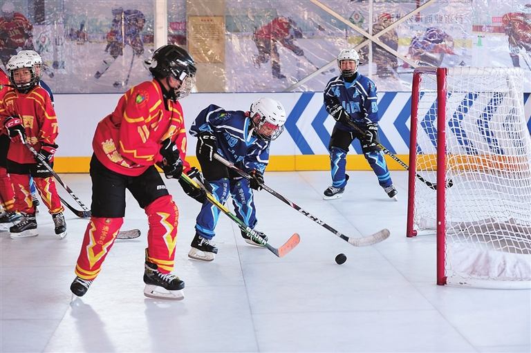 1月24日, 一场生动的冰球比赛让山西通宝育杰学校的学生们过了一把冰球比赛瘾。这是该校开展“冰雪运动进校园”活动的常规赛事,旨在激发学生心系冬奥、努力进取的热情。 李学军 宋卫东 摄